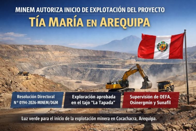 El Ministerio de EnergΓa y Minas (MINEM) autorizΓ³ el inicio de la etapa de explotaciΓ³n del proyecto minero TΓa MarΓa, ubicado en el distrito de Cocachacra, provincia de Islay, en la regiΓ³n Arequipa.